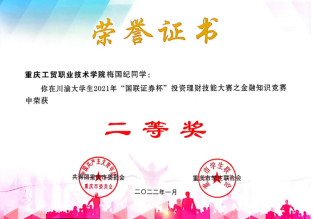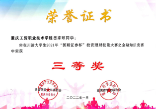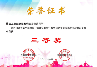 为深学笃用习近平新时代中国特色社会主义思想,深入贯彻落实习近平总书记关于党史学习教育的重要论述和关于高校毕业生就业工作的重要指示精神,引导大学生树立正确的投资理财观念,提升学生社会化能力,推进高校毕业生实现更加充分更高质量就业。2021年,共青团重庆市委、共青团四川省委、重庆市学生联合会、四川省学生联合会联合举办了川渝大学生2021年“国联证券杯”投资理财技能大赛,学校财经学院积极组织投资与理财、金融管理等专业学生参加比赛。