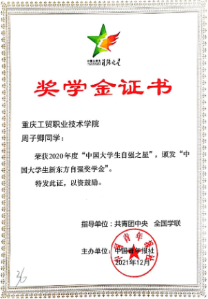 我校财经学院金融管理2019级1班周子卿和健康学院食品检测技术2019级1班邱成松等两名同学荣获“中国大学生自强之星”荣誉称号及奖学金。