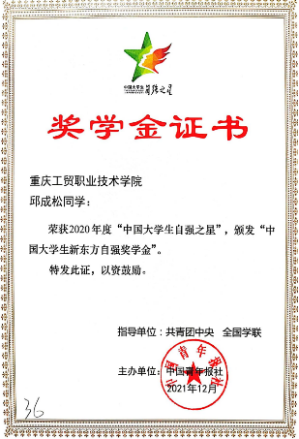 邱成松同学现为学校健康学院食品检测技术2019级1班学生。该同学从小便立志主动服务同学、勇于提升自我,衷于奉献担当。曾担任班长、团支部书记、校团委学生副书记等职务。邱成松同学在学习工作中努力成为同学们的贴心人、老师们的好帮手。进入大学以来,曾先后荣获“国家励志奖学金”、重庆市团干部岗位实践能力大比武高校团支部书记专场赛“一等奖”等奖项20余项。